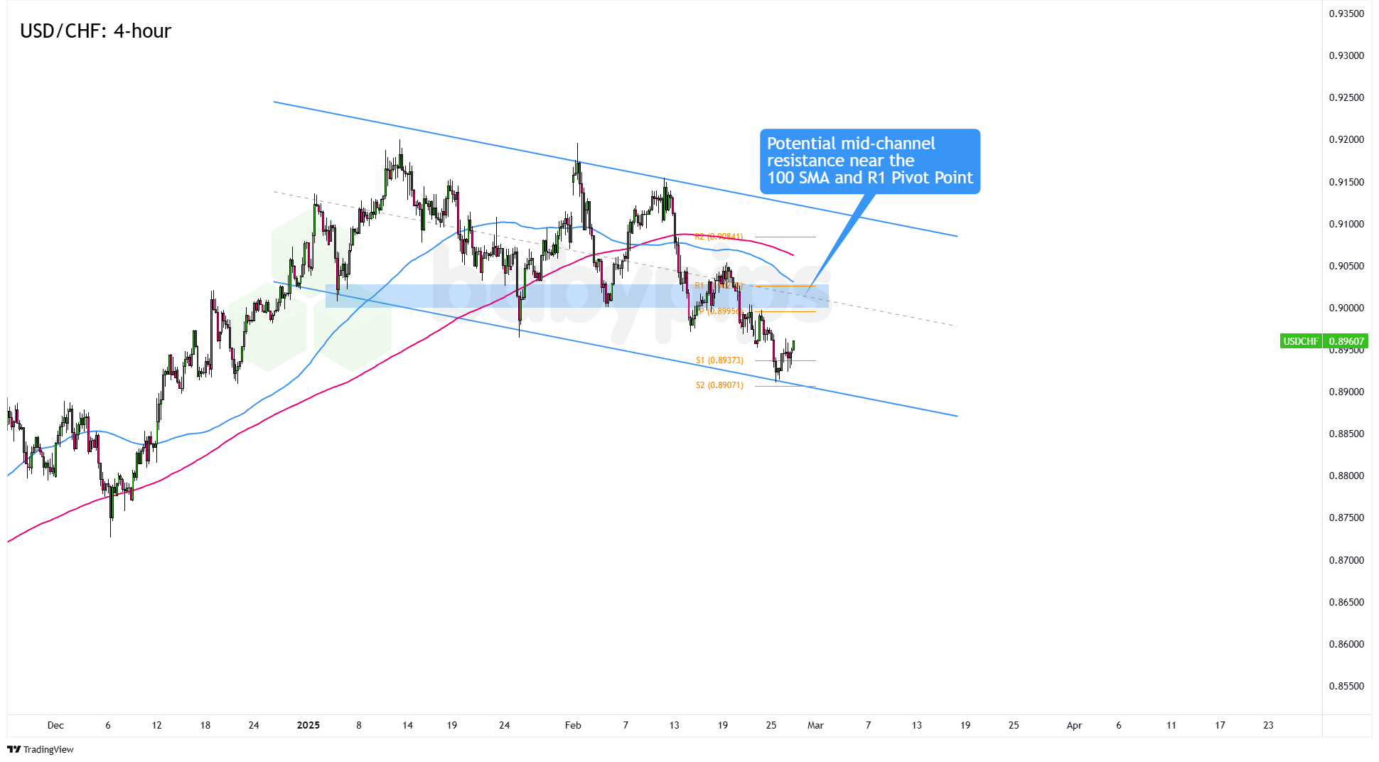 The pair is now hovering just below the .9000 psychological level, which lines up with mid-channel resistance on the 4-hour chart. Interestingly, .9000 is also close to the 100 SMA and the R1 (.9025) Pivot Point line.