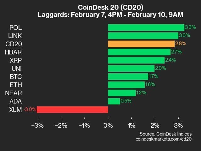 Laggards: XLM (-3.0%) and ADA (+0.5%).