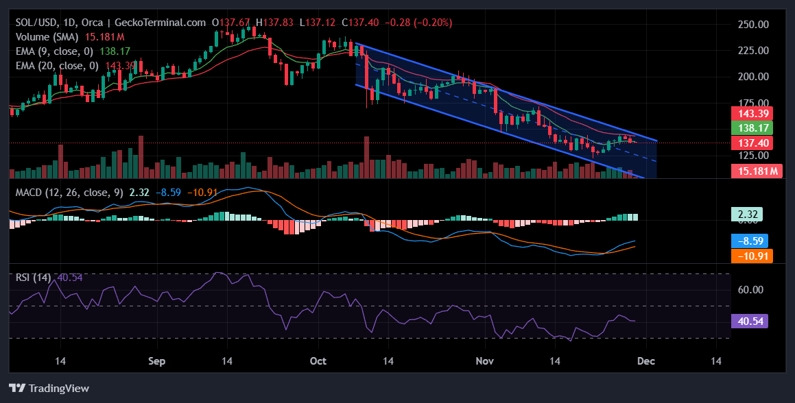 Data from GeckoTerminal shows that SOL trades in a medium-term downtrend. Technical indicators such as short-term Exponential Moving Averages (EMAs), the Moving Average Convergence Divergence (MACD), and the Relative Strength Index (RSI) show that bears still have a tight grip on the altcoin’s price.