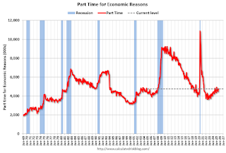 These workers are included in the alternate measure of labor underutilization (U-6) that increased to 8.1% from 7.9% in the previous month. This is down from the record high in April 2020 of 22.9% and up from the lowest level on record (seasonally adjusted) in December 2022 (6.6%). (This series started in 1994). This measure is above the 7.0% level in February 2020 (pre-pandemic).