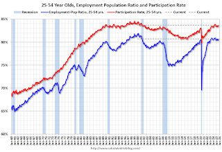 Since the overall participation rate is impacted by both cyclical (recession) and demographic (aging population, younger people staying in school) reasons, here is the employment-population ratio for the key working age group: 25 to 54 years old.