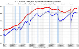 Since the overall participation rate is impacted by both cyclical (recession) and demographic (aging population, younger people staying in school) reasons, here is the employment-population ratio for the key working age group: 25 to 54 years old.