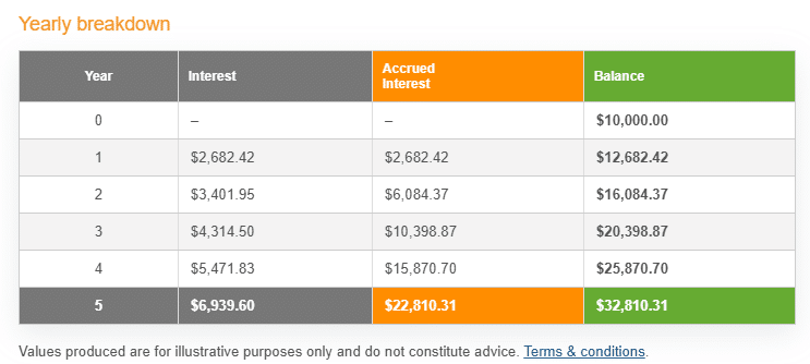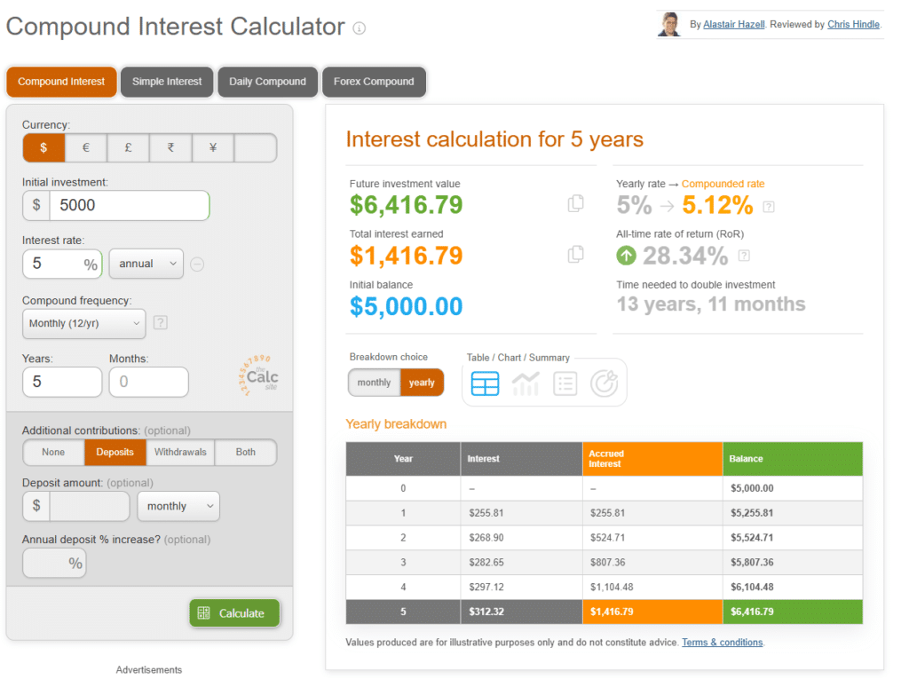 Let’s use the compound interest calculator provided by Thecalculatorsite.com