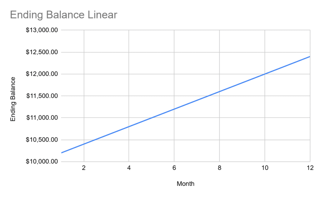 Now, let’s see how, without reinvesting, the account grows in a straight line…