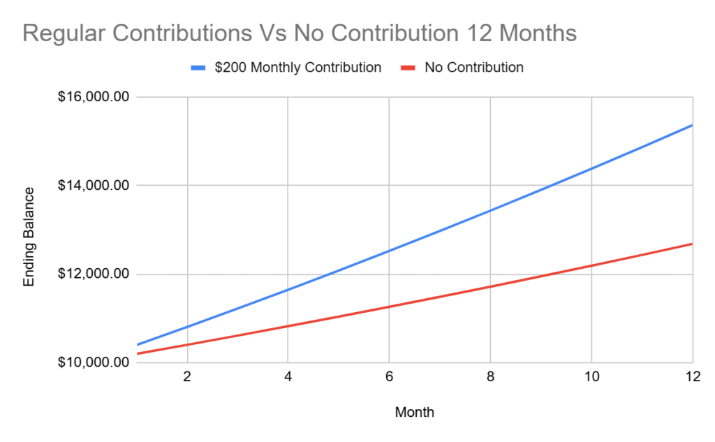 For example, a trader contributing $200 monthly to an account earning 2% per month will experience significantly faster growth than relying just on trading gains.