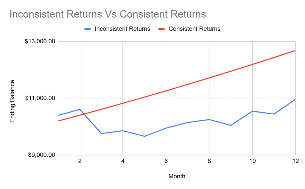 As you can see from the graph above, inconsistent returns severely impact the rate of profitability.