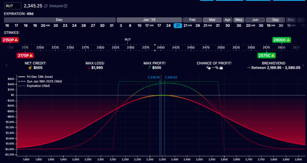 Here is a typical iron condor on the RUT index with the short put and short call at around 15-delta.