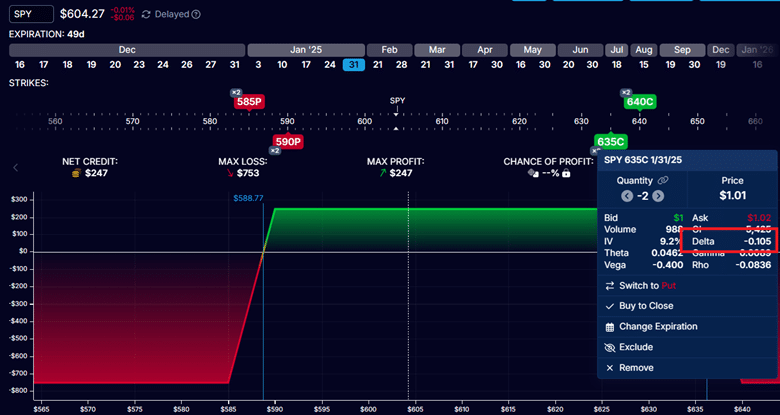 Because the price moved away from the call spread, the short 635 call, originally at around 15-delta, is now showing at 10-delta.