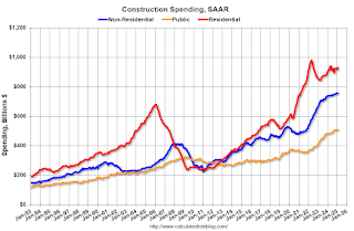 This graph shows private residential and nonresidential construction spending, and public spending, since 1993. Note: nominal dollars, not inflation adjusted.