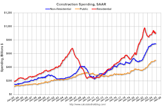 This graph shows private residential and nonresidential construction spending, and public spending, since 1993. Note: nominal dollars, not inflation adjusted.