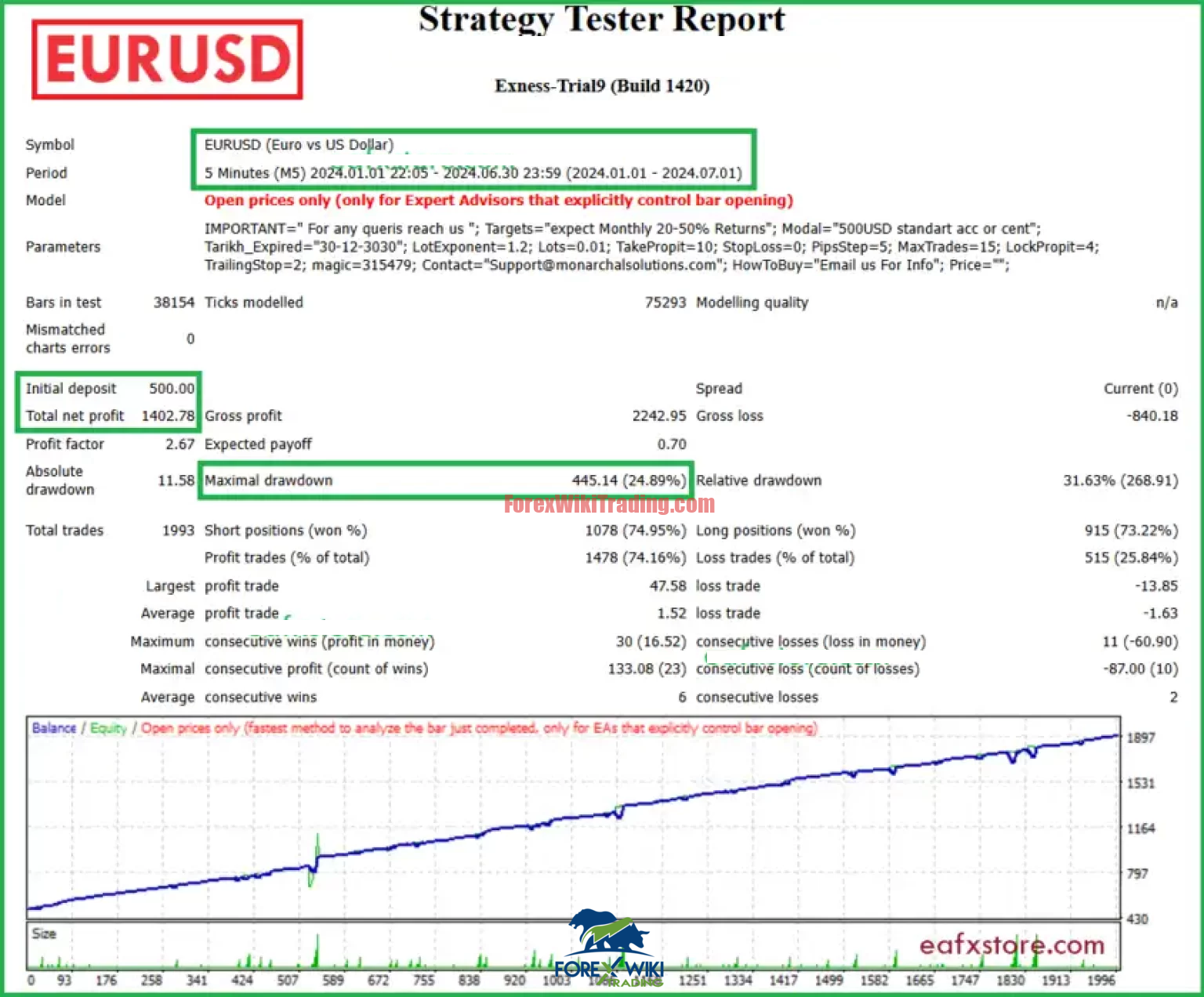 Scenario: EURUSD M5, Jan 1, 2024 – July 1, 2024, $500 Initial Deposit.