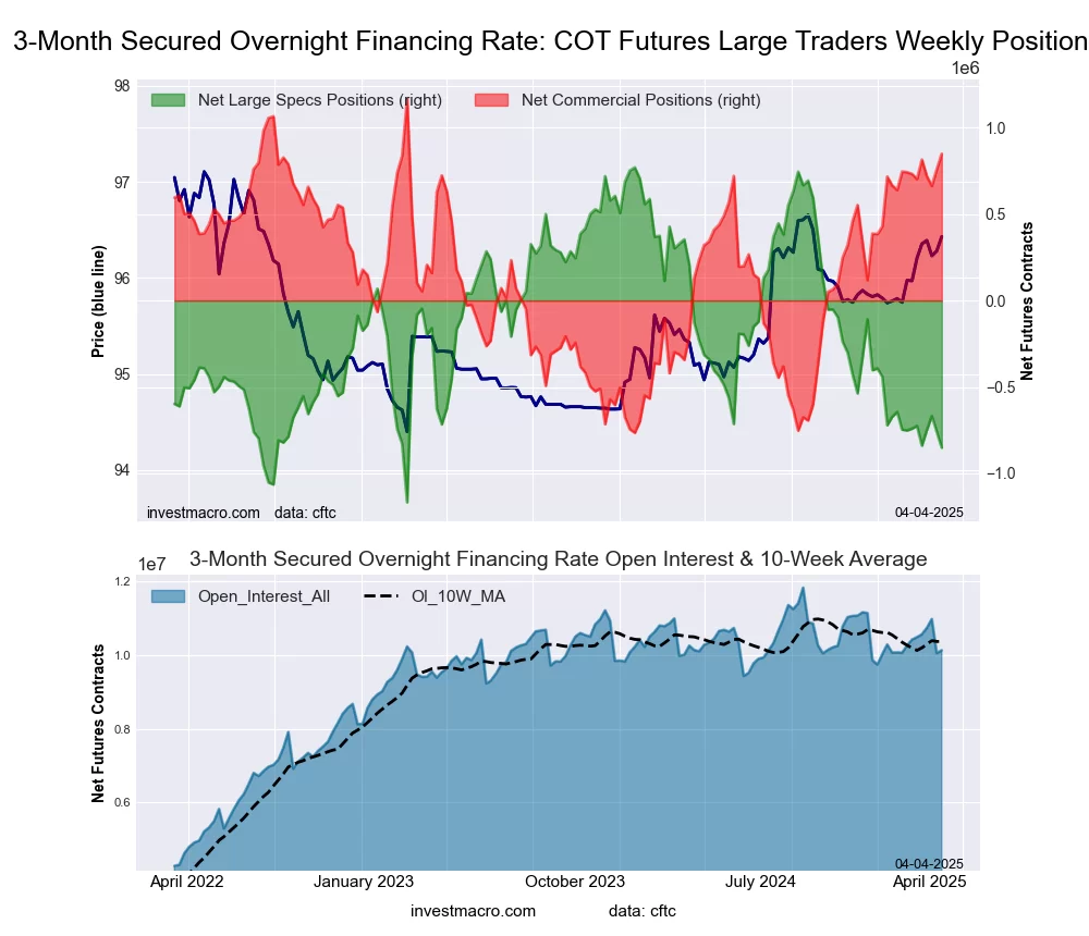 The Secured Overnight Financing Rate (3-Month) large speculator standing this week totaled a net position of -851,283 contracts in the data reported through Tuesday. This was a weekly decrease of -92,060 contracts from the previous week which had a total of -759,223 net contracts.