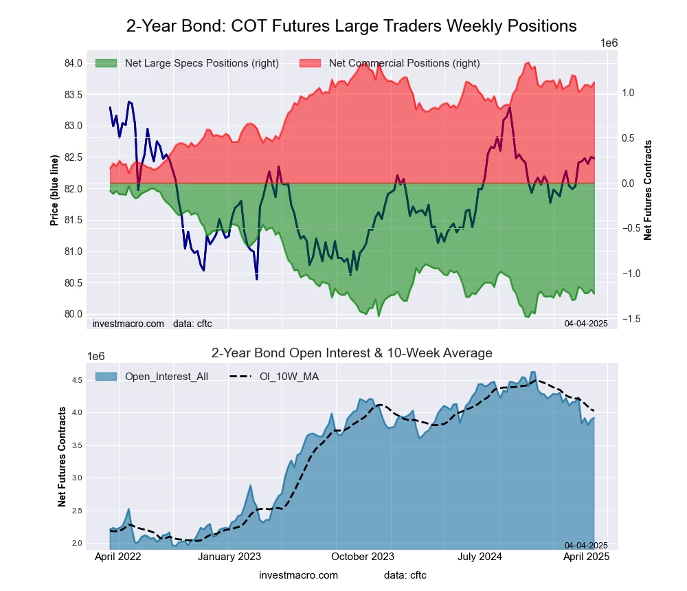 The 2-Year Treasury Note large speculator standing this week totaled a net position of -1,226,391 contracts in the data reported through Tuesday. This was a weekly fall of -44,805 contracts from the previous week which had a total of -1,181,586 net contracts.