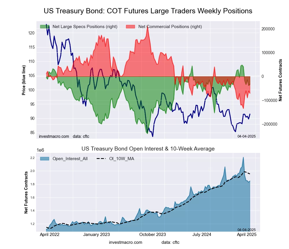 The US Treasury Bonds large speculator standing this week totaled a net position of -32,648 contracts in the data reported through Tuesday. This was a weekly rise of 5,627 contracts from the previous week which had a total of -38,275 net contracts.