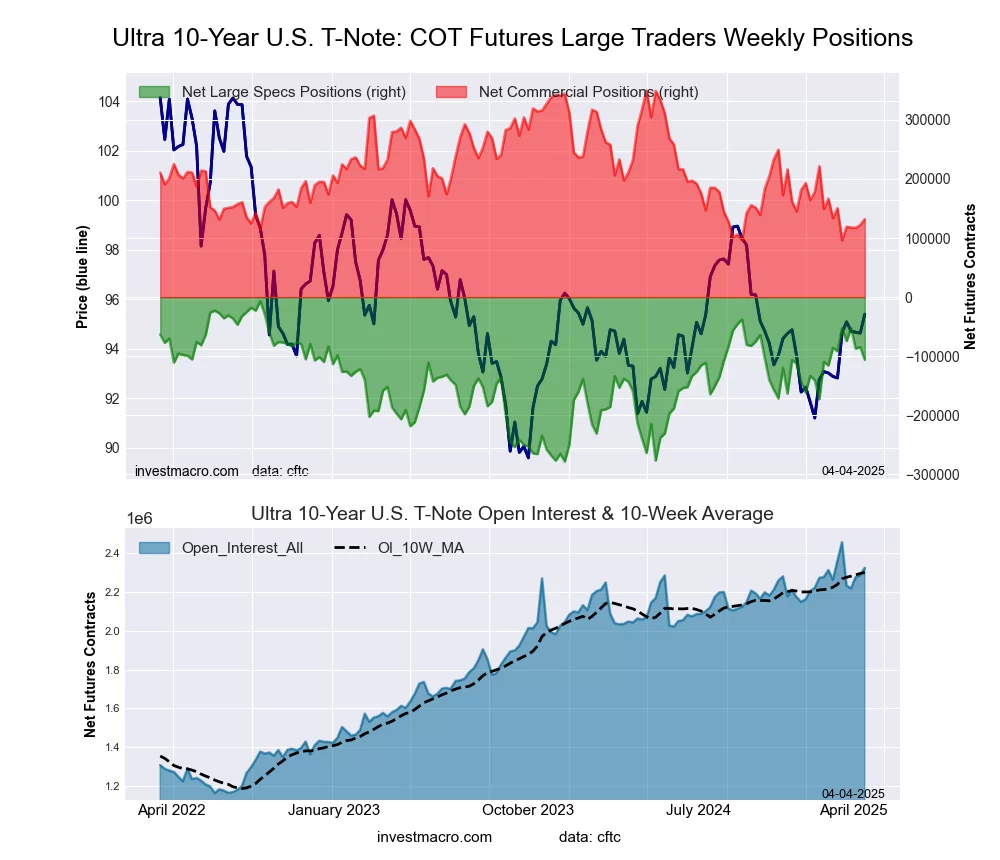 The Ultra 10-Year Notes large speculator standing this week totaled a net position of -105,983 contracts in the data reported through Tuesday. This was a weekly reduction of -21,496 contracts from the previous week which had a total of -84,487 net contracts.