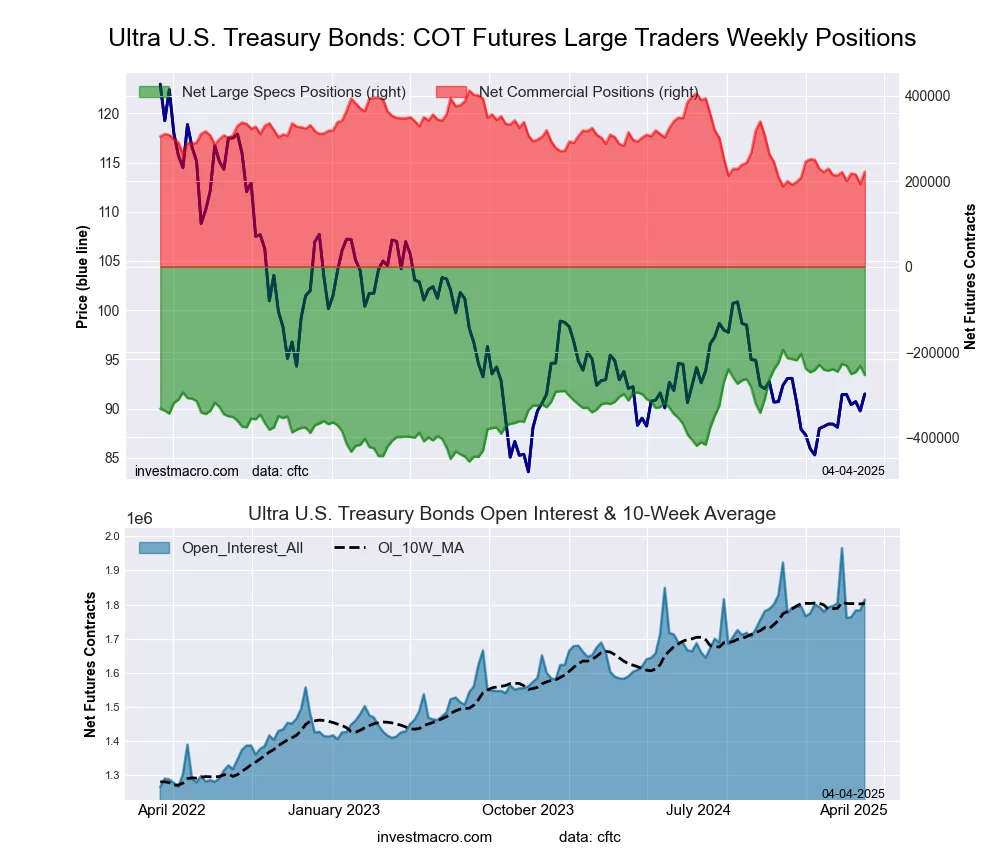 The Ultra US Treasury Bonds large speculator standing this week totaled a net position of -254,029 contracts in the data reported through Tuesday. This was a weekly reduction of -21,663 contracts from the previous week which had a total of -232,366 net contracts.