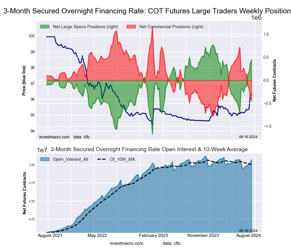 The Secured Overnight Financing Rate (3-Month) large speculator standing this week equaled a net position of 445,064 contracts in the data reported through Tuesday. This was a weekly advance of 77,916 contracts from the previous week which had a total of 367,148 net contracts.