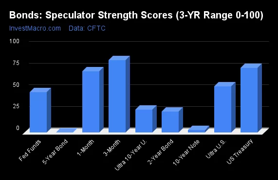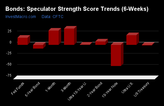 On the downside, the 5-Year Bonds (0 percent) and the 10-Year Bonds (3 percent) come in at the lowest strength level currently and are in Extreme-Bearish territory (below 20 percent). The next lowest strength scores were the 2-Year Bonds (24 percent) and the Ultra 10-Year Bonds (27 percent).
