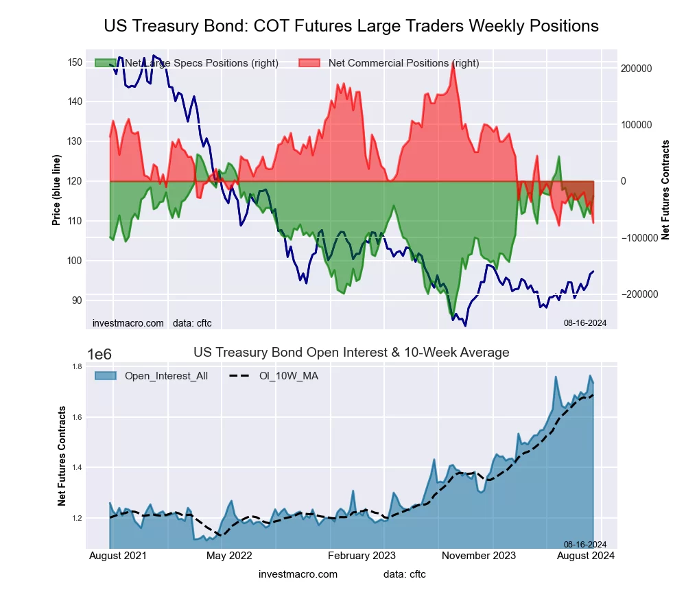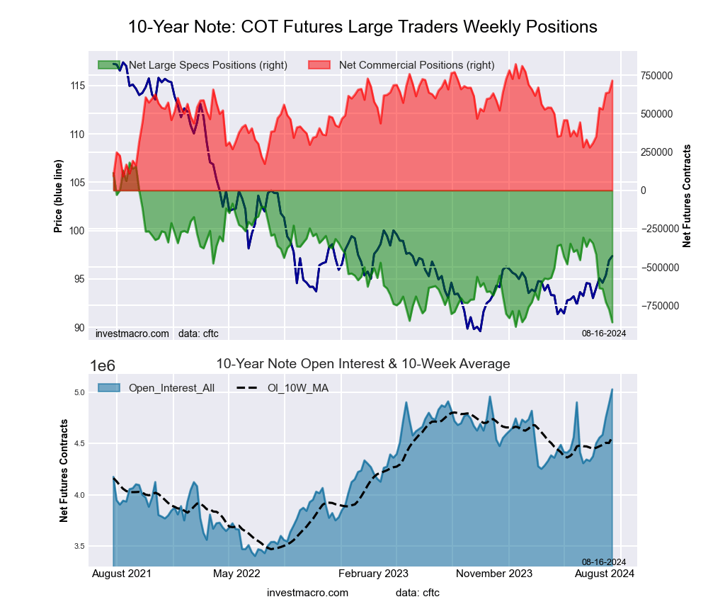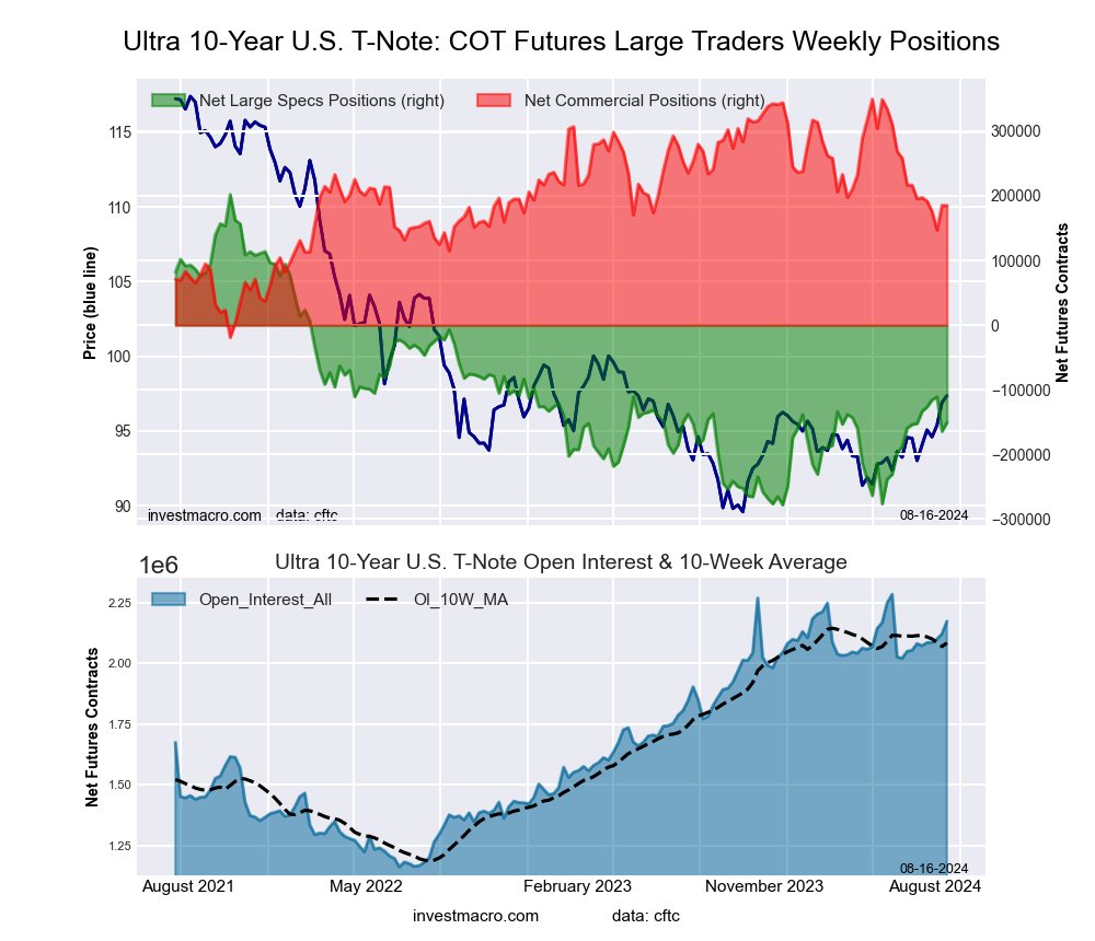 The Ultra 10-Year Notes large speculator standing this week equaled a net position of -150,633 contracts in the data reported through Tuesday. This was a weekly advance of 13,624 contracts from the previous week which had a total of -164,257 net contracts.