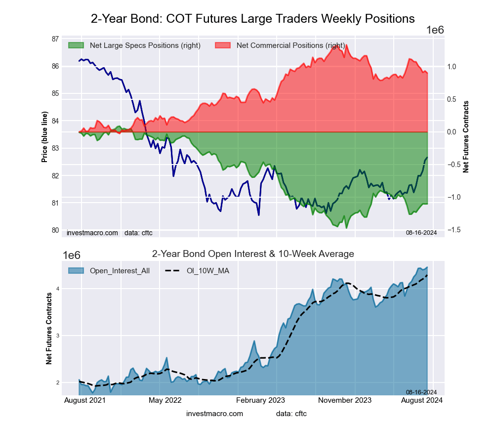 The 2-Year Treasury Note large speculator standing this week equaled a net position of -1,104,606 contracts in the data reported through Tuesday. This was a weekly gain of 605 contracts from the previous week which had a total of -1,105,211 net contracts.
