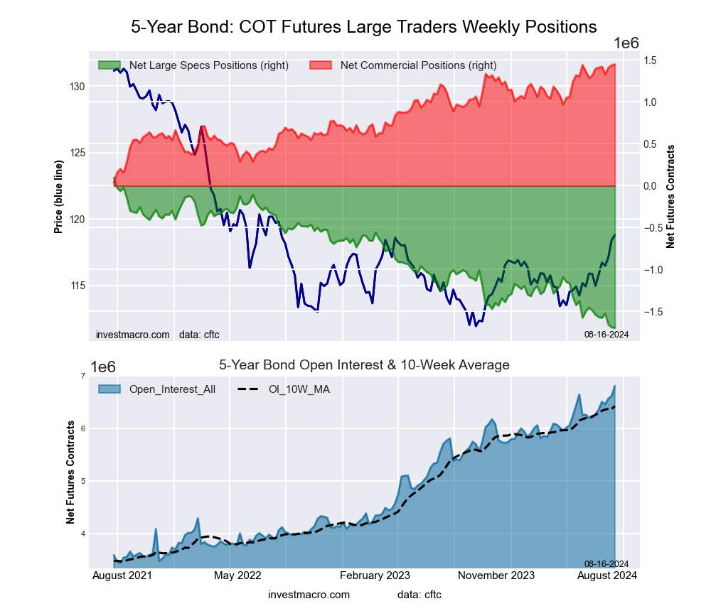 The 5-Year Treasury Note large speculator standing this week equaled a net position of -1,695,072 contracts in the data reported through Tuesday. This was a weekly decrease of -6,996 contracts from the previous week which had a total of -1,688,076 net contracts.