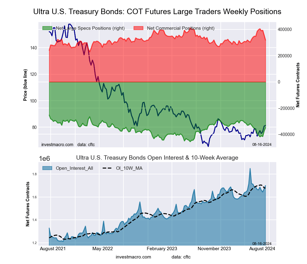 The Ultra US Treasury Bonds large speculator standing this week equaled a net position of -349,133 contracts in the data reported through Tuesday. This was a weekly gain of 27,529 contracts from the previous week which had a total of -376,662 net contracts.