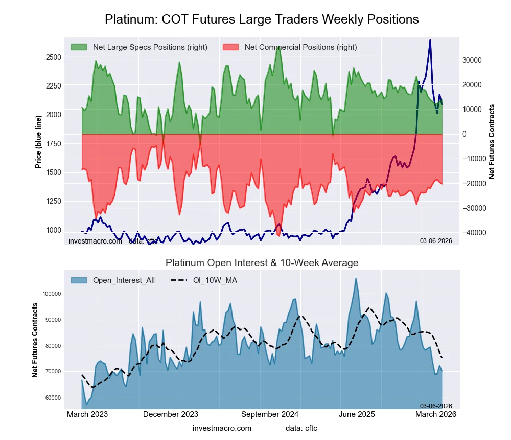 The Platinum Futures large speculator standing this week totaled a net position of 13,832 contracts in the data reported through Tuesday. This was a weekly advance of 592 contracts from the previous week which had a total of 13,240 net contracts.