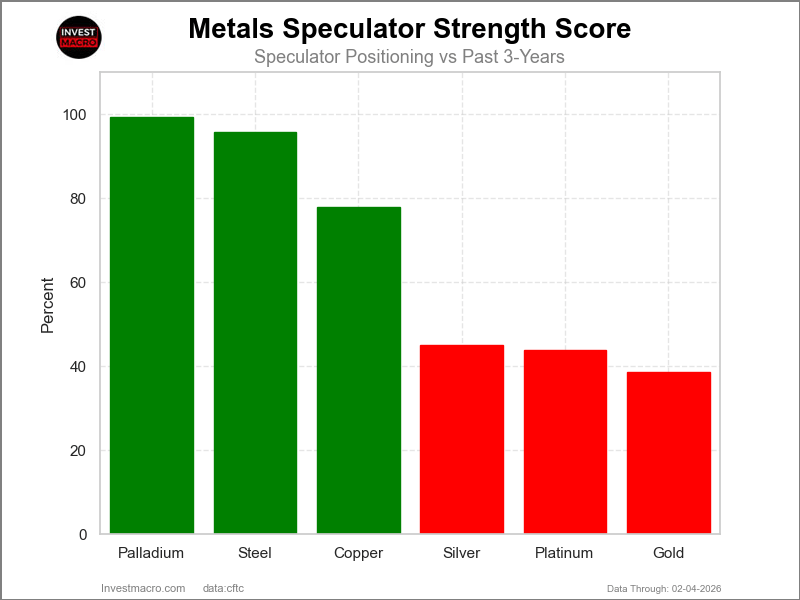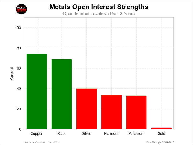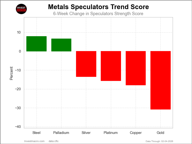 COT Strength Score Trends (or move index, calculates the 6-week changes in strength scores) showed that Steel (8 percent) and Palladium (7 percent) lead the past six weeks trends for metals.