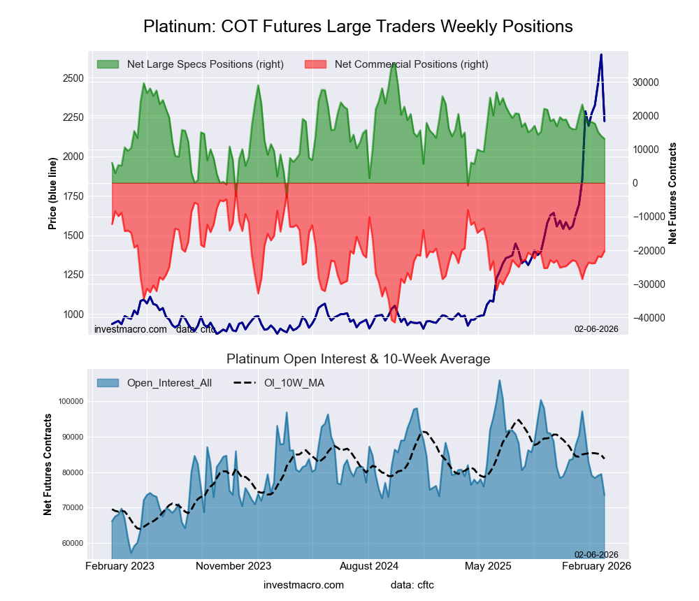 The Platinum Futures large speculator standing this week resulted in a net position of 13,106 contracts in the data reported through Tuesday. This was a weekly lowering of -816 contracts from the previous week which had a total of 13,922 net contracts.