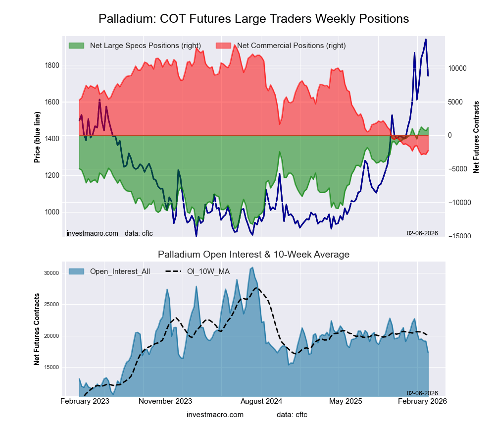 The Palladium Futures large speculator standing this week resulted in a net position of 1,133 contracts in the data reported through Tuesday. This was a weekly advance of 449 contracts from the previous week which had a total of 684 net contracts.