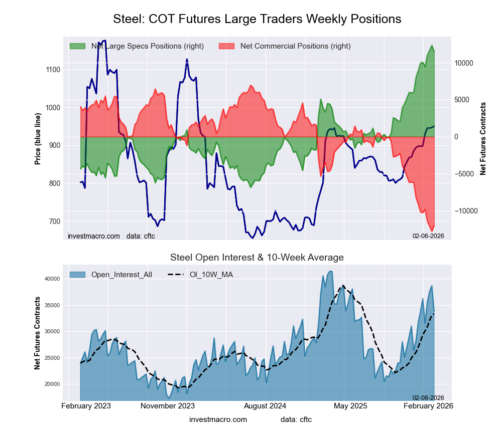 The Steel Futures large speculator standing this week resulted in a net position of 11,487 contracts in the data reported through Tuesday. This was a weekly decline of -853 contracts from the previous week which had a total of 12,340 net contracts.