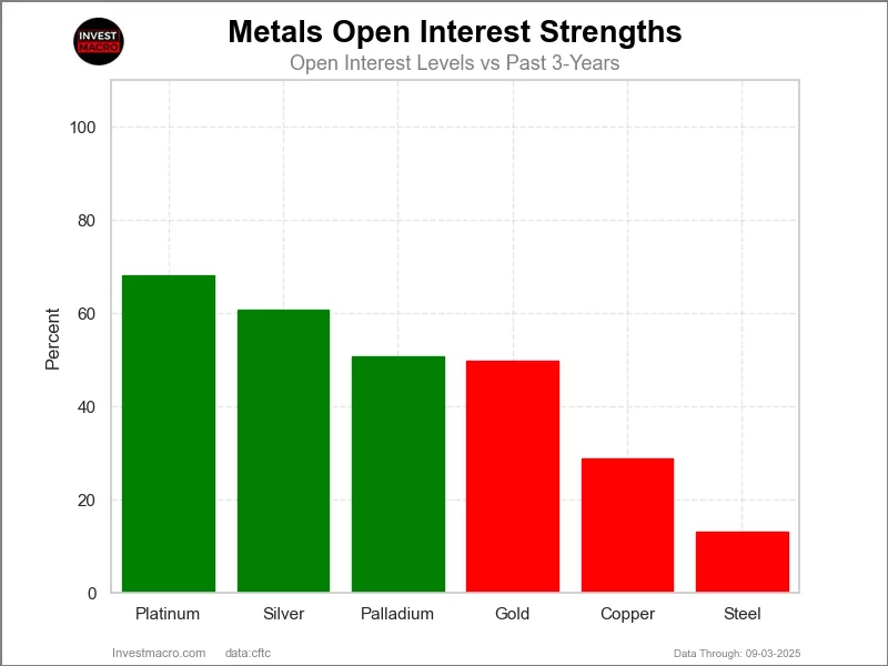COT Strength Score Trends (or move index, calculates the 6-week changes in strength scores) showed that Gold (-1 percent) and Steel (-2 percent) lead the past six weeks trends for metals with the least negative trend scores. The overall negative trend scores show that despite high speculator strength levels, the sentiment has cooled off somewhat over that past 6 weeks.