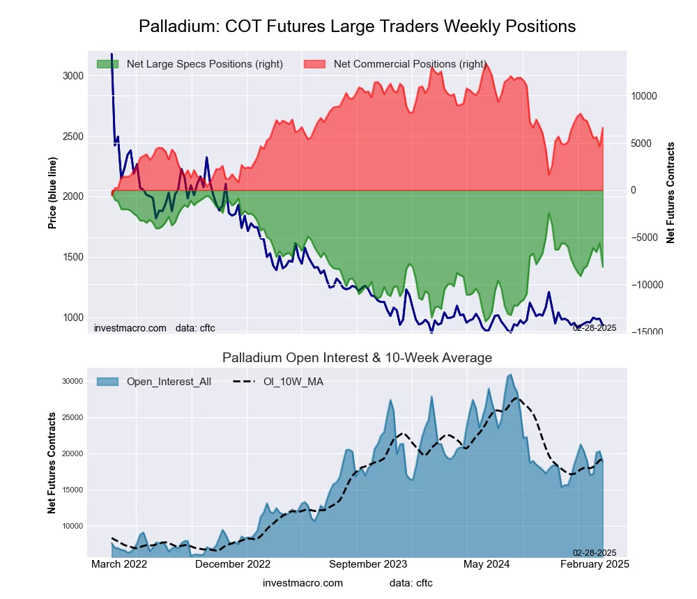 The Palladium Futures large speculator standing this week equaled a net position of -8,134 contracts in the data reported through Tuesday. This was a weekly decline of -2,503 contracts from the previous week which had a total of -5,631 net contracts.