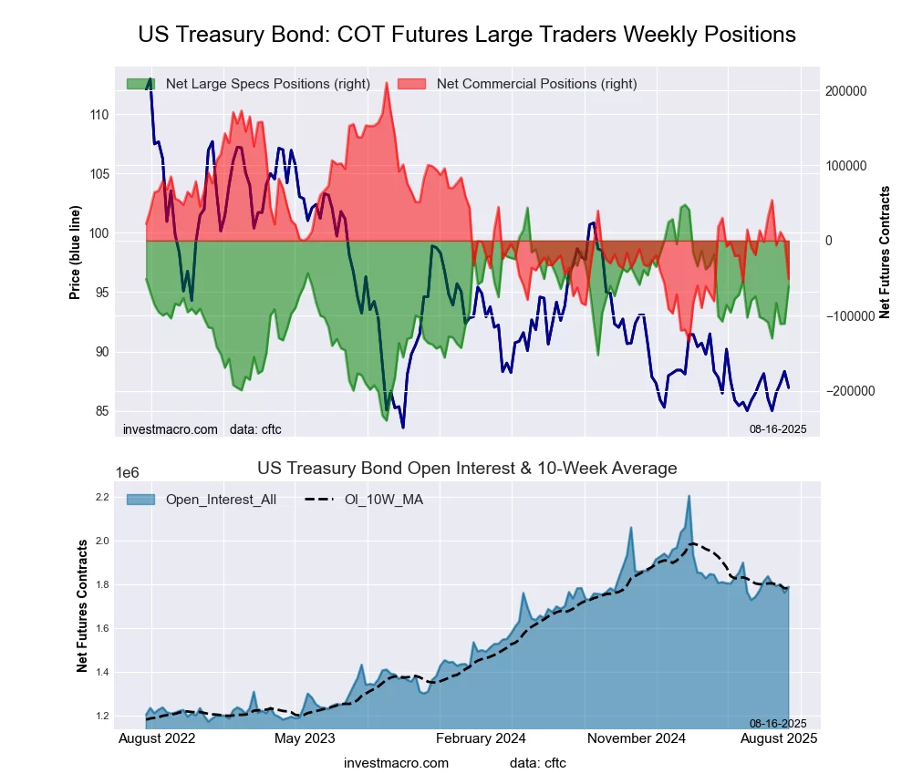 The bond markets with declines in speculator bets for the week were the 2-Year Bonds (-54,074 contracts), the 5-Year Bonds (-29,492 contracts), the Fed Funds (-6,397 contracts), the SOFR 1-Month (-3,468 contracts) and with the Ultra 10-Year Bonds (-699 contracts) also having lower bets on the week.