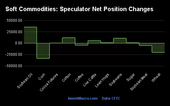 Leading the gains for the softs markets was Soybean Oil (35,433 contracts) with Cotton (12,027 contracts), Soybeans (10,898 contracts), Live Cattle (5,659 contracts), Lean Hogs (1,088 contracts), Sugar (1,031 contracts) and Cocoa (323 contracts) also showing positive weeks.