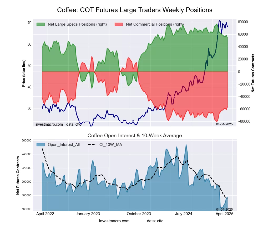 COFFEE Futures COT ChartThe COFFEE large speculator standing this week totaled a net position of 54,063 contracts in the data reported through Tuesday. This was a weekly decline of -4,389 contracts from the previous week which had a total of 58,452 net contracts.