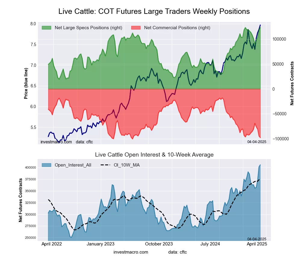 LIVE CATTLE Futures COT ChartThe LIVE CATTLE large speculator standing this week totaled a net position of 123,646 contracts in the data reported through Tuesday. This was a weekly lift of 5,659 contracts from the previous week which had a total of 117,987 net contracts.