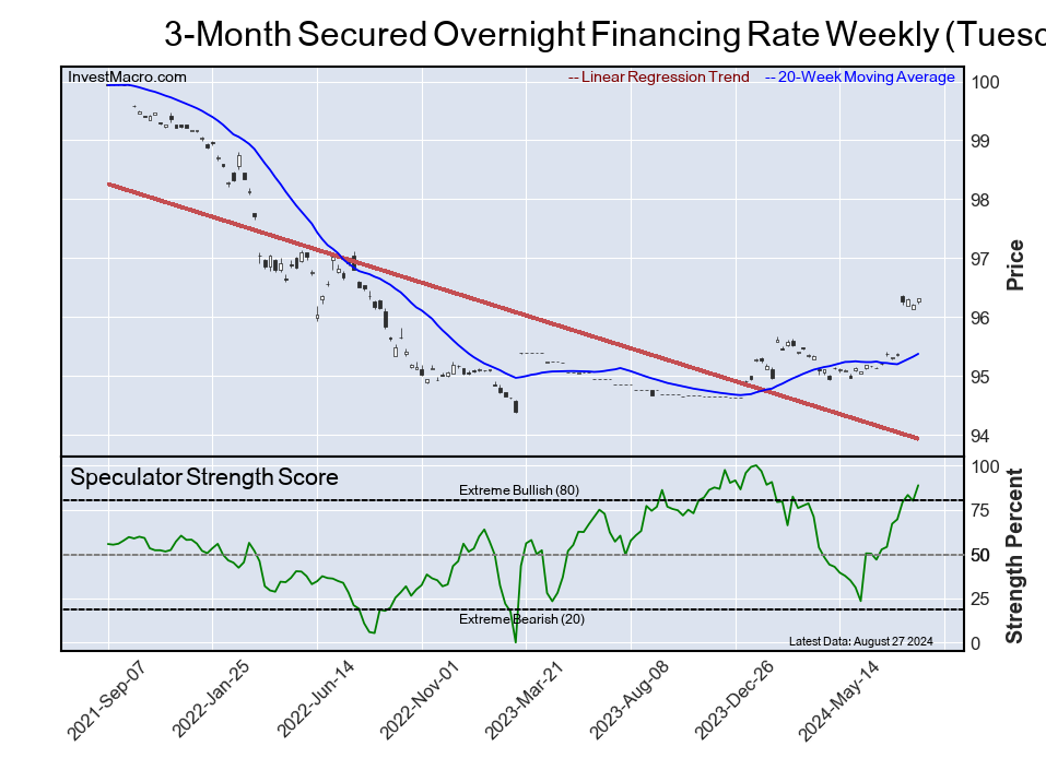 The 3-Month Secured Overnight Financing Rate speculator position rounds out the top five in this week’s bullish extreme standings. The 3-Month Secured Overnight Financing Rate speculator level sits at a 88.7 percent score of its 3-year range. The six-week trend for the speculator strength score was 34.8 this week.