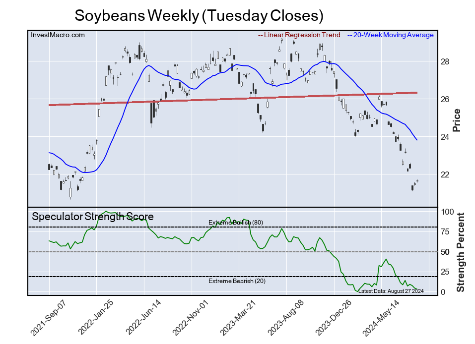 The six-week trend for the speculator strength score was -8.0 this week. The overall speculator position was -52,963 net contracts this week with a decline of -2,008 contracts in the speculator bets.