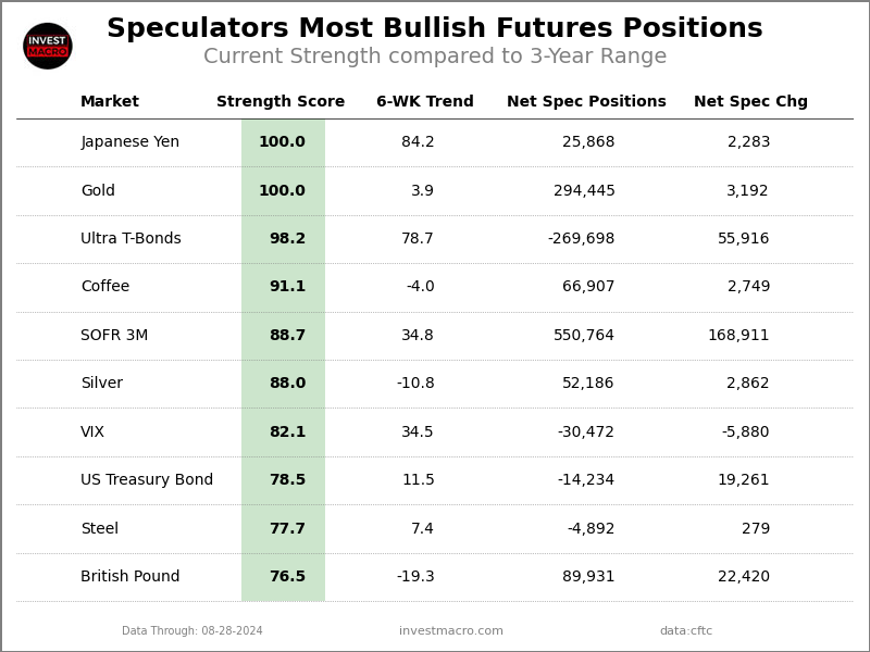 This weekly Extreme Positions report highlights the Most Bullish and Most Bearish Positions for the speculator category. Extreme positioning in these markets can foreshadow strong moves in the underlying market.