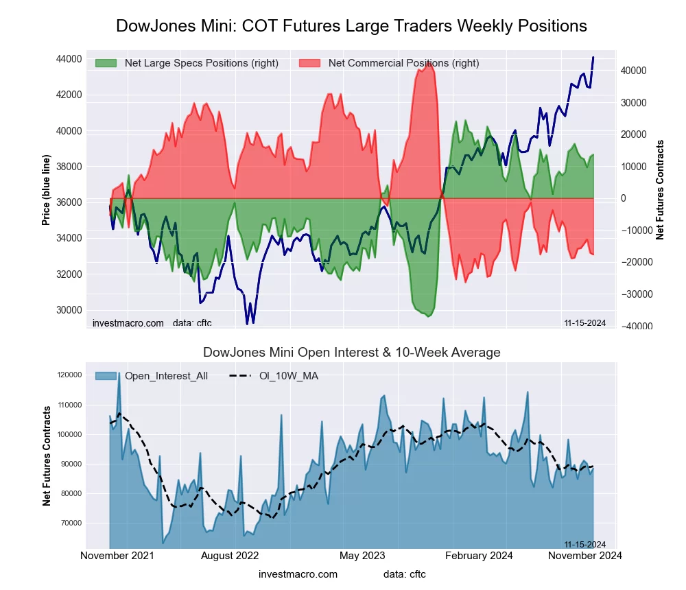 The Dow Jones Mini large speculator standing this week was a net position of 13,666 contracts in the data reported through Tuesday. This was a weekly advance of 735 contracts from the previous week which had a total of 12,931 net contracts.