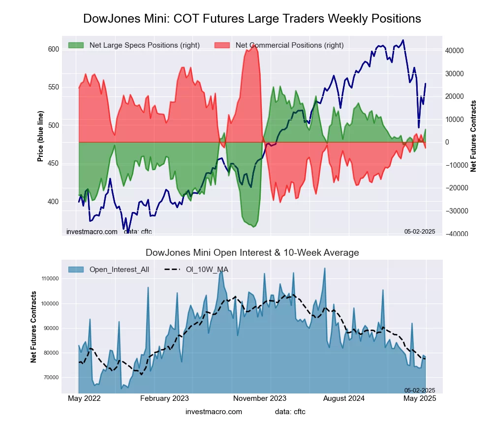 The Dow Jones Mini large speculator standing this week recorded a net position of 5,549 contracts in the data reported through Tuesday. This was a weekly boost of 4,662 contracts from the previous week which had a total of 887 net contracts.