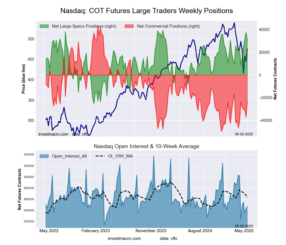 The Nasdaq Mini large speculator standing this week recorded a net position of 30,863 contracts in the data reported through Tuesday. This was a weekly fall of -6,817 contracts from the previous week which had a total of 37,680 net contracts.