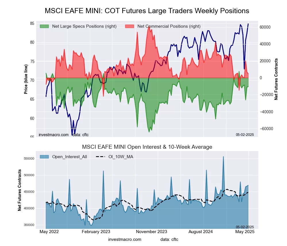 The MSCI EAFE Mini large speculator standing this week recorded a net position of -10,432 contracts in the data reported through Tuesday. This was a weekly increase of 618 contracts from the previous week which had a total of -11,050 net contracts.