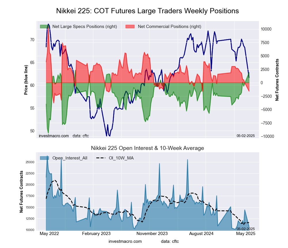 The Nikkei Stock Average (USD) large speculator standing this week recorded a net position of 1,904 contracts in the data reported through Tuesday. This was a weekly lift of 2,025 contracts from the previous week which had a total of -121 net contracts.