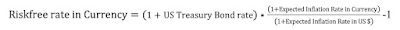 If expected inflation is lower in US dollars than in rupees, the cost of capital that you should obtain for a company in US dollars will be lower than the cost of capital in rupees, with the difference reflecting the expected inflation differential. However, since your cash flows will also then have to be in US dollars, the expected growth that you should use should reflect the lower inflation rate in dollars, and if you stay consistent in your inflation estimates, the effects should cancel out. This is not just theory, but common sense. Currency is a measurement mechanism, and to claim that a company is undervalued in one currency (say, the rupee) while claiming that it is overvalued at the same time in another currency (say, the US dollar) makes no sense. To practitioners who will counter with examples, where the value is different, when you switch currencies, my response is that there is a currency view (that the rupee is under or over priced relative to the dollar) in your valuation in your valuation, and that view should not be bundled together with your company story in a valuation.