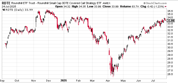 RDTE takes things a step further by selling zero-day-to-expiration (0DTE) index options on small caps.