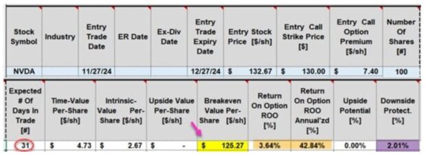 - If exercised at the breakeven (BE) price of $125.27-yellow cell), the NVDA is purchased at a 2.01% discount (purple cell)
