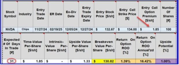 ITM call strikes consist of both time-value and intrinsic-value (the amount the strike is lower than current market value). This results in a lower breakeven price than at-the-money or out-of-the-money call strikes, or additional insurance to the downside. This is paid for by the option buyer (not us) in the form of intrinsic-value, With NVDA trading at $132.67, the ITM $130.00 strike shows a bid price of $7.40 (pink row, green arrow).