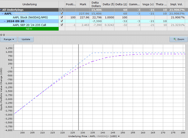 Identify a call option slightly out of the money, such as the 235 strike price, for monthly covered calls.